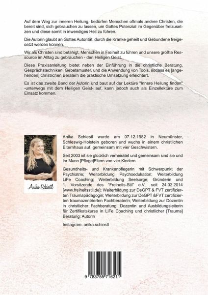 Auf dem Weg zur inneren Heilung, bedürfen Menschen oftmals andere Christen, die bereit sind, sich gebrauchen zu lassen, um Gottes Potenzial im Gegenüber freizusetzen und diese somit in inwendiges Heil zu führen.Die Autorin glaubt an Gottes Autorität, durch die Kranke geheilt und Gebundene freigesetzt werden können.Wir als Christen sind befähigt, Menschen in Freiheit zu führen und unsere größte Ressource im Alltag zu gebrauchen - den Heiligen Geist.Diese Praxisanleitung bietet neben der Einführung in die christliche Beratung, Gesprächstechniken, Gebetsmuster, und die Anwendung von Tools, sodass es [angehenden] christlichen Beratern die praktische Umsetzung erleichtert.Es ist das zweite Band der Autorin und baut auf der Lektüre "Innere Heilung finden" -unterwegs mit dem Heiligen Geist- auf, kann jedoch auch als Einzellektüre zum Einsatz kommen.