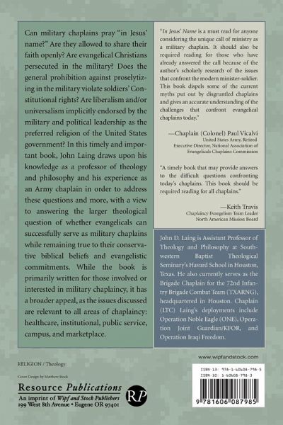 Can military chaplains pray "in Jesus' name?" Are they allowed to share their faith openly? Are evangelical Christians persecuted in the military? Does the general prohibition against proselytizing in the military violate soldiers' Constitutional rights? Are liberalism and/or universalism implicitly endorsed by the military and political leadership as the preferred religion of the United States government? In this timely and important book, John Laing draws upon his knowledge as a professor of theology and philosophy and his experience as an Army chaplain in order to address these questions and more, with a view to answering the larger theological question of whether evangelicals can successfully serve as military chaplains while remaining true to their conservative biblical beliefs and evangelistic commitments. While the book is primarily written for those involved or interested in military chaplaincy, it has a broader appeal, as the issues discussed are relevant to all areas of chaplaincy: healthcare, institutional, public service, campus, and marketplace.