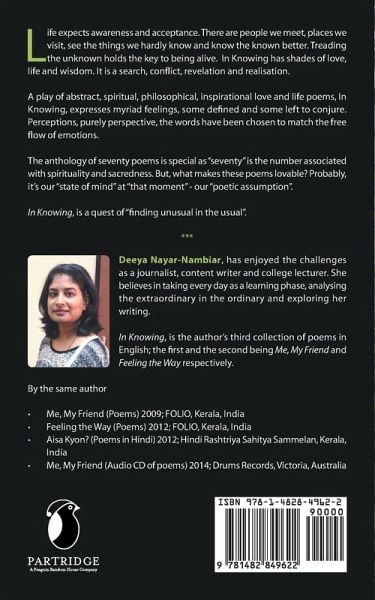 Deeya Nayar-Nambiar, has enjoyed the challenges as a journalist, content writer and college lecturer. She believes in taking every day as a learning phase, analysing the extraordinary in the ordinary and exploring her writing. In Knowing, is the author's third collection of poems in English; the first and the second being Me, My Friend and Feeling the Way respectively. By the same author . Me, My Friend (Poems) 2009; FOLIO, Kerala, India . Feeling the Way (Poems) 2012; FOLIO, Kerala, India . Aisa Kyon? (Poems in Hindi) 2012; Hindi Rashtriya Sahitya Sammelan, Kerala, India . Me, My Friend (Audio CD of poems) 2014; Drums Records, Victoria, Australia