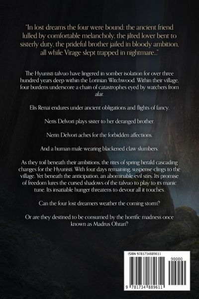 Turn of the screw terror meets abominable horror in this dark sci-fi fantasy tale circling four pasts filled with lust, violence, and longing. In Lost Dreams the Four Were Bound marks the first entry into a universe of sword and sorcery action within a cruel sci-fi world. Reviews "A vivid fantasy with shocks that accompany the author's inventiveness." - Kirkus Reviews "A high fantasy novel with the feel of a folktale, punctuated with a science fiction twist..." - BlueInk Review "The bleak landscape provides an evocative backdrop for characters obsessed with lust, power, duty, and death... Fantasy lovers with large appetites will be gripped." - The Prairies Book Review "His knack for building characters with pathos and wit, his immersive dystopian world, and stellar prose... This dark tale is sure to impress." - BookView Review "A well-imagined dive into a science-fiction fantasy world in which the reader will be swept along with the riveting narrative." - Literary Titan "A story that is felt rather than read, with passages washing over the reader..." - OnlineBookClub "A dark fantasy novel that introduces a complex world..." - Foreword Clarion Reviews Description In lost dreams the four were bound: the ancient friend lulled by comfortable melancholy, the jilted lover bent to sisterly duty, the prideful brother jailed in bloody ambition, all while Virage slept trapped in nightmare... For over three hundred years, a tribe of elvish Hyunisti talvuo has lingered in somber isolation deep within the giant trees and briar trails of the Lorinian Witchwood. Within their treetop village, the burdens of four outsiders underscore a chain of catastrophes eyed by watchers from afar. These chains weigh upon them, each a strand of past friendship, star-crossed love, resentment, and tragedy. While the outsiders toil beneath their ambitions, the rites of spring herald cascading changes for the forest folk. With four days remaining, suspense clings to the village. Yet beneath the anticipation, an abominable evil stirs. Its promise of freedom lures the cursed villagers to play to its manic tune. Its insatiable hunger threatens to devour all it touches. Can the four dreamers weather the coming storm? Or are they destined to be consumed by the horrific madness welling from the depths of the forest? Fantasy, mystery, swords, and sorcery await you in In Lost Dreams the Four Were Bound!