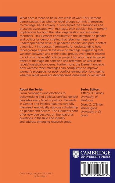 What does it mean to be in love while at war? This Element demonstrates that whether rebel groups commit themselves to marriage, bar it entirely, or reinterpret the ceremonies and practices associated with marriage, their decision has important implications for both the rebel organization and individual members. This Element contributes to the literature on gender and politics by demonstrating that rebel marriages are an under-appreciated driver of gendered conflict and post-conflict dynamics. This Element introduces frameworks for understanding how rebel groups approach the issue of marriage, suggesting that variation between and within rebel groups over time is related to not only the rebels' political project, but also the anticipated effect of marriage on cohesion and retention, and the rebels' logistical concerns. Furthermore, the Element unpacks how wartime rebel marriages can complicate or improve women's prospects for post-conflict reintegration by shaping whether rebel wives are depoliticized, distrusted, or reclaimed.
