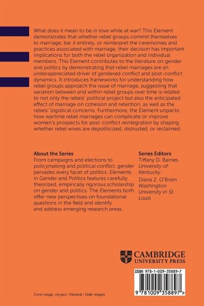 What does it mean to be in love while at war? This Element demonstrates that whether rebel groups commit themselves to marriage, bar it entirely, or reinterpret the ceremonies and practices associated with marriage, their decision has important implications for both the rebel organization and individual members. This Element contributes to the literature on gender and politics by demonstrating that rebel marriages are an under-appreciated driver of gendered conflict and post-conflict dynamics. This Element introduces frameworks for understanding how rebel groups approach the issue of marriage, suggesting that variation between and within rebel groups over time is related to not only the rebels' political project, but also the anticipated effect of marriage on cohesion and retention, and the rebels' logistical concerns. Furthermore, the Element unpacks how wartime rebel marriages can complicate or improve women's prospects for post-conflict reintegration by shaping whether rebel wives are depoliticized, distrusted, or reclaimed.