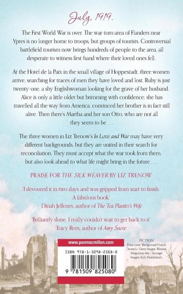 July, 1919. The First World War is over. The war-torn area of Flanders near Ypres is no longer home to trenches or troops, but groups of tourists. Controversial battlefield tourism now drives busloads of people to witness first-hand where loved ones fell. At the Hotel de la Paix in the small village of Poperinghe, three women have come to the battlefields to find a trace of men they have loved and lost. Ruby is just twenty-one, a shy Englishwoman looking for the grave of her husband. Alice is only a little older but brimming with confidence; she has travelled all the way from America, convinced her brother is in fact still alive and in France. Then there's Martha, and her son Otto, who are not all they seem to be . . . The three women in Liz Trenow's In Love and War may have very different backgrounds, but they are united in their search for reconciliation: to resolve themselves to what the war took from them, but also to what life might still promise for the future . . . Praise for The Silk Weaver by Liz Trenow: 'I devoured it in two days and was gripped from start to finish. A fabulous book.' Dinah Jefferies, author of The Tea Planter's Wife 'Brilliantly done. I really couldn't wait to get back to it.' Tracy Rees, author of Amy Snow