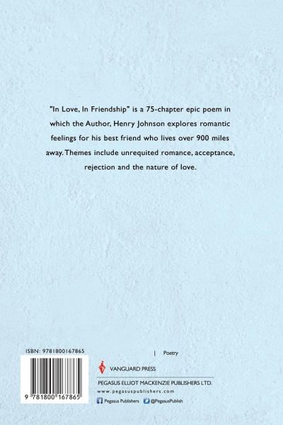"In Love, In Friendship" is a 75-chapter epic poem in which the Author, Henry Johnson explores romantic feelings for his best friend who lives over 900 miles away. Themes include unrequited romance, acceptance, rejection and the nature of love.