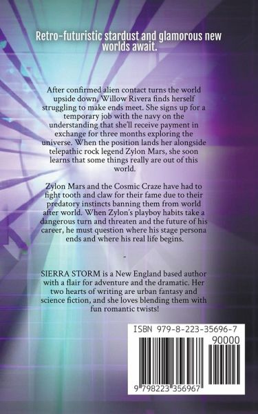 Retro-futuristic stardust and glamorous new worlds await. After confirmed alien contact turns the world upside down, Willow Rivera finds herself struggling to make ends meet. She signs up for a temporary job with the navy on the understanding that she'll receive payment in exchange for three months exploring the universe. When the position lands her alongside telepathic rock legend Zylon Mars, she soon learns that some things really are out of this world. Zylon Mars and the Cosmic Craze have had to fight tooth and claw for their fame, due to their predatory instincts banning them from world after world. When Zylon's playboy habits take a dangerous turn and threaten the future of his career, he must question where his stage persona ends and where his real life begins. This book is a PG-13 romance with light sexual tension, a strong emotional pull and a happy ending.