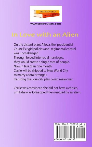 On the distant plant Alloca, the presidential Council's rigid policies and regimental control was unchallenged. Through forced interracial marriages, they would create a single race of people. Now in less than one month Carrie will be shipped to New World City to marry a total stranger. Resisting the council's plan could mean war. Carrie was convinced she did not have a choice, until she was kidnapped then rescued by an alien.