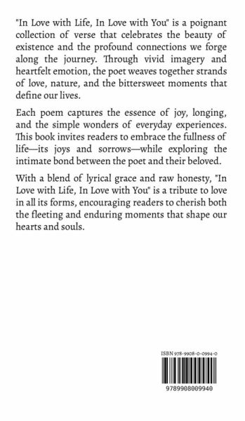 "In Love with Life, In Love with You" is a poignant collection of verse that celebrates the beauty of existence and the profound connections we forge along the journey. Through vivid imagery and heartfelt emotion, the poet weaves together strands of love, nature, and the bittersweet moments that define our lives. Each poem captures the essence of joy, longing, and the simple wonders of everyday experiences. This book invites readers to embrace the fullness of life-its joys and sorrows-while exploring the intimate bond between the poet and their beloved. With a blend of lyrical grace and raw honesty, "In Love with Life, In Love with You" is a tribute to love in all its forms, encouraging readers to cherish both the fleeting and enduring moments that shape our hearts and souls.