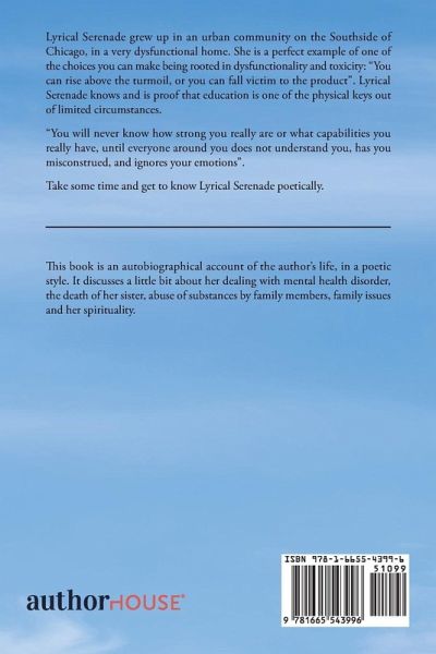 This book is an autobiographical account of the author's life, in a poetic style. It discusses a little bit about her dealing with mental health disorder, the death of her sister, abuse of substances by family members, family issues and her spirituality.