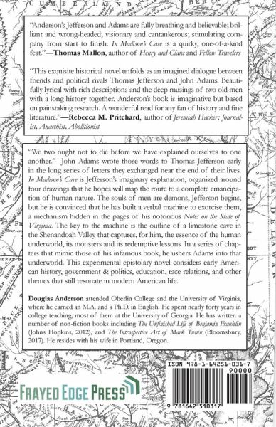"We two ought not to die before we have explained ourselves to one another." John Adams wrote those words to Thomas Jefferson early in the long series of letters they exchanged near the end of their lives. In Madison's Cave is Jefferson's imaginary explanation, organized around four drawings that he hopes will map the route to a complete emancipation of human nature. The souls of men are demons, Jefferson begins, but he is convinced that he has built a verbal machine to exorcise them, a mechanism hidden in the pages of his notorious Notes on the State of Virginia. The key to the machine is the outline of a limestone cave in the Shenandoah Valley that Jefferson made not long after the death of his wife and that captures, for him, the essence of the human underworld, its monsters and its redemptive lessons. In a series of chapters that mimic those of his infamous book, he ushers Adams into that underworld. This experimental epistolary novel considers early American history, government & politics, education, race relations, and other themes that still resonate in modern American life.