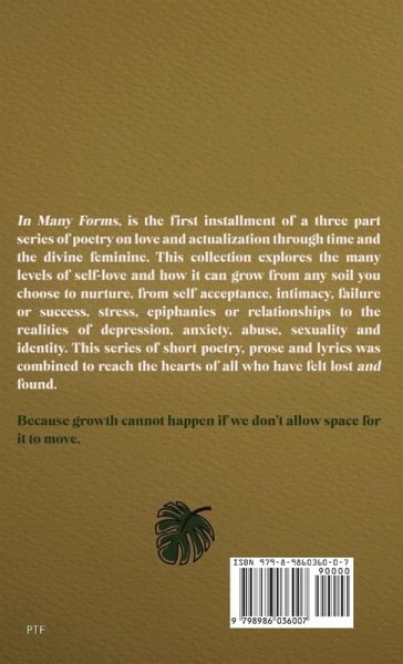 In Many Forms, is the first installment of a three part series of poetry on love and actualization through time, reflection and divine feminine energy. This collection explores the many levels of self-love and how it can grow from any soil you choose to nurture, from self acceptance, intimacy, failure or success, stress, epiphanies or relationships to the realities of depression, anxiety, abuse, sexuality and identity. This series of short poetry, prose and lyrics was combined to reach the hearts of all who have felt lost and found. Because growth cannot happen if we don't allow space for it to move.