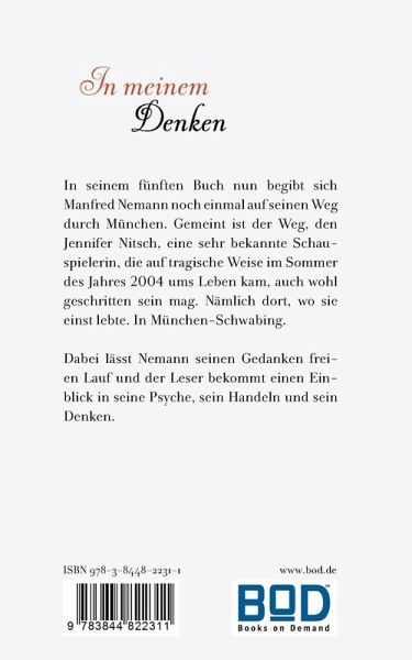 In seinem fünften Buch nun begibt sich Manfred Nemann noch einmal auf seinen Weg durch München. Gemeint ist der Weg, den Jennifer Nitsch, eine sehr bekannte Schauspielerin, die auf tragische Weise im Sommer des Jahres 2004 ums Leben kam, auch wohl geschritten sein mag. Nämlich dort, wo sie einst lebte. In München-Schwabing.Dabei lässt Nemann seinen Gedanken freien Lauf und der Leser bekommt einen Einblick in seine Psyche, sein Handeln und sein Denken.