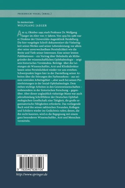 Nachruf auf Wolfgang Jaeger.- Hermann von Helmholtz und die Begründung der Augenheilkunde als wissenschaftliches Fach in der Mitte des 19. Jahrhunderts.- Wolfgang Jaeger als akademischer und klinischer Lehrer.- Wolfgang Jaeger: Seine Bedeutung für die Rehabilitation in der Augenheilkunde.- Wolfgang Jaeger: Forschungen über Farbe und Farbensinn.- Wolfgang Jaeger und die Geisteswissenschaften.- Wolfgang Jaeger - Schriftführer der Deutschen Ophthalmologischen Gesellschaft von 1959 bis 1986.- Ausgewählte Veröffentlichungen von Wolfgang Jaeger.