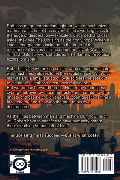 A ruthless mega-corporation controlled by a mechanized madman has driven China's working class to the edge of desperation. With their lives crushed under relentless exploitation, the hope of revolution has become their only escape. When a kinetic energy bomb obliterates the heart of the resistance, it leaves millions dead, the city of Xi'an in ruins, and the survivors shattered. The flame of revolution fizzles to a spark. Only Robert Lilly, a lowly private, refuses to surrender. Born with the ability to talk to machines, Robert devises a plan to outsmart the corporation's forces. With nothing but his wits and a small but loyal squad at his side, he sets out on a perilous mission to dismantle the corporation's most dangerous weapon. Betrayed by allies, hunted by a merciless cyborg, and haunted by the devastation left in his wake, Robert struggles with the crushing weight of leadership. As the lines between hero and villain blur, Robert must decide how far he's willing to go to bring down an empire bent on destroying his world. When faced with a choice between saving the future or his own humanity, will Robert become the very thing he set out to destroy? The Uprising must succeed-but at what price?