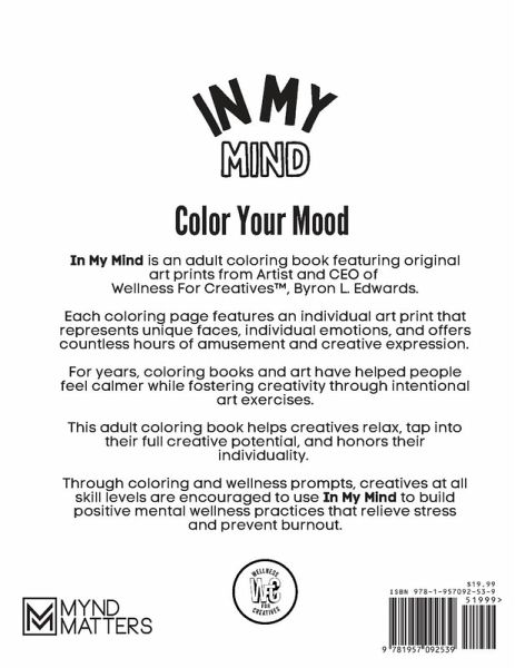 In My Mind is an adult coloring book featuring original art prints from Artist and CEO of Wellness For CreativesTM, Byron L. Edwards. Each coloring page features an individual art print that represents unique faces, individual emotions, and offers countless hours of amusement and creative expression. For years, coloring books and art have helped people feel calmer while fostering creativity through intentional art exercises. This adult coloring book helps creatives relax, tap into their full creative potential, and honors their individuality. Through coloring and wellness prompts, creatives at all skill levels are encouraged to use In My Mind to build positive mental wellness practices that relieve stress and prevent burnout.