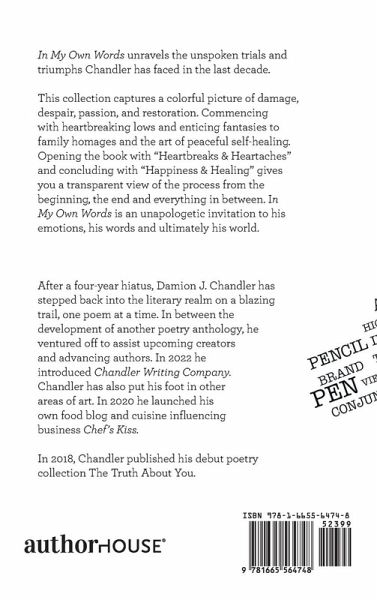 In My Own Words unravels the unspoken trials and triumphs Chandler has faced in the last decade. This collection captures a colorful picture of damage, despair, passion, and restoration. Commencing with heartbreaking lows and enticing fantasies to family homages and the art of peaceful self-healing. Opening the book with "Heartbreaks & Heartaches" and concluding with "Happiness & Healing" gives you a transparent view of the process from the beginning, the end and everything in between. In My Own Words is an unapologetic invitation to his emotions, his words and ultimately his world.