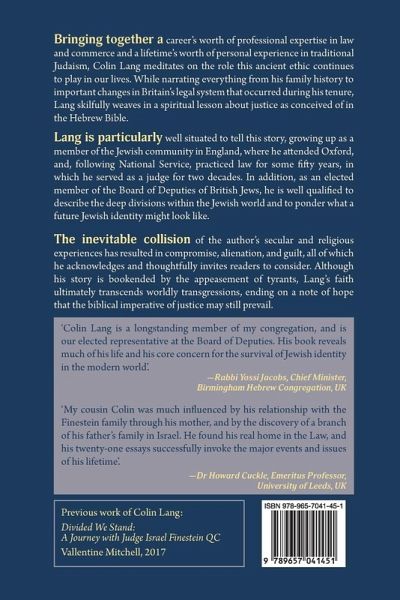 Bringing together a career's worth of professional expertise in law and commerce and a lifetime's worth of personal experience in traditional Judaism, Colin Lang meditates on the role this ancient ethic continues to play in our lives. While narrating everything from his family history to important changes in Britain's legal system that occurred during his tenure, Lang skilfully weaves in a spiritual lesson about justice as conceived of in the Hebrew Bible. Lang is particularly well situated to tell this story, growing up as a member of the Jewish community in England, where he attended Oxford, and, following National Service, practiced law for some fifty years, in which he served as a judge for two decades. In addition, as an elected member of the Board of Deputies of British Jews, he is well qualified to describe the deep divisions within the Jewish world and to ponder what a future Jewish identity might look like.The inevitable collision of the author's secular and religious experiences has resulted in compromise, alienation, and guilt, all of which he acknowledges and thoughtfully invites readers to consider. Although his story is bookended by the appeasement of tyrants, Lang's faith ultimately transcends worldly transgressions, ending on a note of hope that the biblical imperative of justice may still prevail.