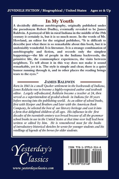 A decidedly different autobiography, originally published under the pseudonym Robert Dudley, eventually revealed to be James Baldwin. A portrayal of life in rural Indiana in the middle of the 19th century it certainly is, but it is so much more. In the words of Mr. Howland, an editor for the original publisher, "It is difficult to describe just what there is so remarkable about this book, but it is undeniably wonderful. It is literature. It is a strange combination of autobiography and fiction, and records only the simplest happenings -- the life of people in the Indiana backwoods, the primitive life, the commonplace experiences, the visits between neighbors. To tell about it in this way does not make it sound remarkable, yet it is. The style is simple and clear; there is a quiet humor running through it, and in other places the reading brings tears to the eyes." Suitable for ages 10 and up.