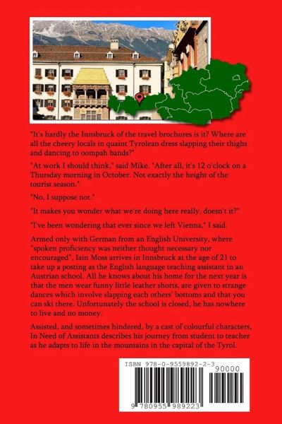 Armed only with German from an English University, where "spoken proficiency was neither thought necessary nor encouraged", the author arrives in Innsbruck at the age of 21 to take up a posting as the English language assistant in an Austrian school. All he knows about his home for the next year is that the men wear funny leather shorts and you can ski there. Unfortunately the school is closed, he has nowhere to live and no money. Assisted, and sometimes hindered, by a cast of colourful characters, In Need of Assistants describes his journey from student to teacher as he adapts to life in the mountains in the capital of the Tyrol.