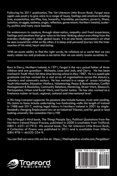 Following his 2011 publication, The Yet Unknown Little Brown Book, Fergal once again uses poetry to give voice to a range of issues, feelings and emotions including love, expectation, sacrifice, loss, humanity, friendship, perception, poverty, illness, isolation, struggle, sadness, anger, reflection, government, Northern Irealnd, austerity, politics and many more besides. He endeavours to capture, through observation, empathy and lived experience, feelings and emotions that give voice to his inner thinking about everything from the everday challenges to wider global issues. It is on one hand, commentary on what he sees around him whilst on the other, it is deep and personal journey into the inner reaches of his mind, heart and being. With an acute ability to find the right words, he refelects on a world that we can easily relate too and produces a narrative that we can easily locate ourselves in.