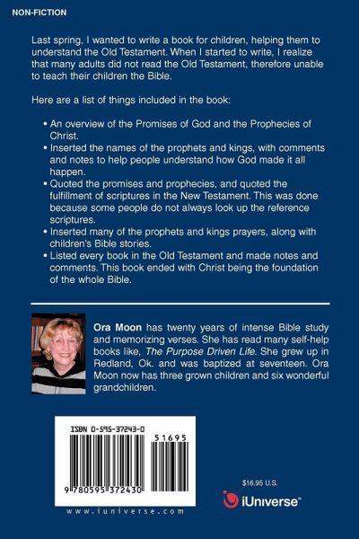 Last spring, I wanted to write a book for children, helping them to understand the Old Testament. When I started to write, I realize that many adults did not read the Old Testament, therefore unable to teach their children the Bible. Here are a list of things included in the book: An overview of the Promises of God and the Prophecies of Christ. Inserted the names of the prophets and kings, with comments and notes to help people understand how God made it all happen. Quoted the promises and prophecies, and quoted the fulfillment of scriptures in the New Testament. This was done because some people do not always look up the reference scriptures. Inserted many of the prophets and kings prayers, along with children's Bible stories. Listed every book in the Old Testament and made notes and comments. This book ended with Christ being the foundation of the whole Bible.
