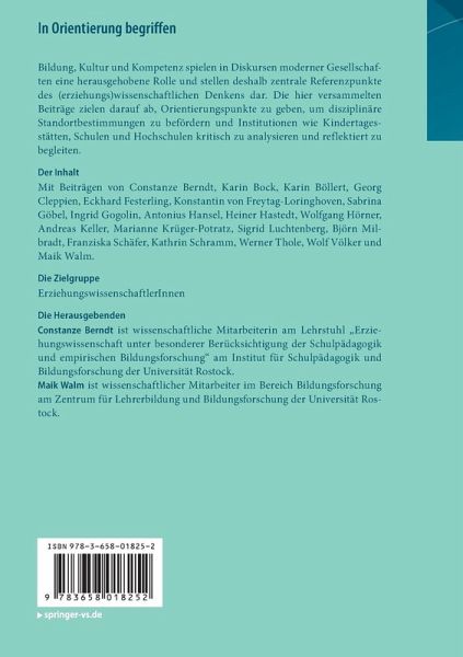 Bildung, Kultur und Kompetenz spielen in Diskursen moderner Gesellschaften eine herausgehobene Rolle und stellen deshalb zentrale Referenzpunkte des (erziehungs)wissenschaftlichen Denkens dar. Die hier versammelten Beiträge zielen darauf ab, Orientierungspunkte zu geben, um disziplinäre Standortbestimmungen zu befördern und Institutionen wie Kindertagesstätten, Schulen und Hochschulen kritisch zu analysieren und reflektiert zu begleiten.