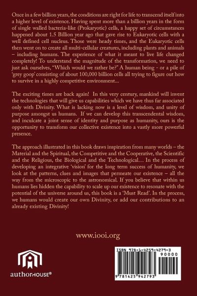Once in a few billion years, the conditions are right for life to transcend itself into a higher level of existence. Having spent more than a billion years in the form of single walled bacteria-like (Prokaryotic) cells, a happy set of circumstances happened about 1.5 Billion year ago that gave rise to Eukaryotic cells with a well defined cell nucleus. Those were heady times, and the Eukaryotic cells then went on to create all multi-cellular creatures, including plants and animals - including humans. The meaning of what it means to live life changed completely! To understand the magnitude of the transformation, we need to just ask ourselves, "Which would we rather be?" A human being - or a pile of 'grey goop' consisting of about 100,000 billion cells all trying to figure out how to survive in a highly competitive environment. The exciting times are back again! In this very century, mankind will invent the technologies that give us capabilities which we have thus far associated only with Divinity. What is lacking now is a level of wisdom, and unity of purpose amongst us humans - to seize the opportunity to define a totally new level of existence. If we can develop this transcendental wisdom, and inculcate a joint sense of identity and purpose as humans, we have the opportunity to transform our collective existence into a vastly more powerful presence. The approach illustrated in this book combines the best of many worlds - the Material and the Spiritual, the Competitive and the Cooperative, the Scientific and the Religious, the Biological and the Technological. In the process of developing an integrative 'vision' for the long term success of humanity, we look at the patterns, clues and images that permeate our existence - all the way from the microscopic to the astronomical. If you believe that within us humans lies hidden the capability to scale up our existence to resonate with the potential of the universe around us, this book is a 'Must Read'. In the process, we humans would create our own Divinity, or add our contributions to an already existing Divinity!