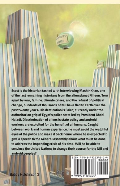 Scott is the historian tasked with interviewing Mashir Khan, one of the last remaining Nill historians from the alien planet Nilleon. Torn apart by war, famine. climate crises, and the refusal of political change, the Nill were forced to flee or die from the collapsing world around them. Hundreds of thousands of Nill fled to Earth over the past twenty years. The United Nations has now called a special session of the General Assembly to address the Nill Refugee Crisis. Scott has one week in Cairo to learn from Mashir while avoiding the authoritarian grip of Egypt's police state led by President Abdel Haladi. Promises of a great future for the people of Egypt are backed by recent advancements in android technology resulting in the creation of a new class of workers exploited by the world machine and subjected to systemic violence. The lives of the wealthiest humans continue to improve while the majority of the world reaps the punishments of this futuristic, dystopian world. Scott is expected to give a speech to the General Assembly about what must be done to address the impending crisis of his time. Will liberation prove to be a solely human achievement, or will Scott be able to convince the United Nations to change their course for the Nill and android peoples?