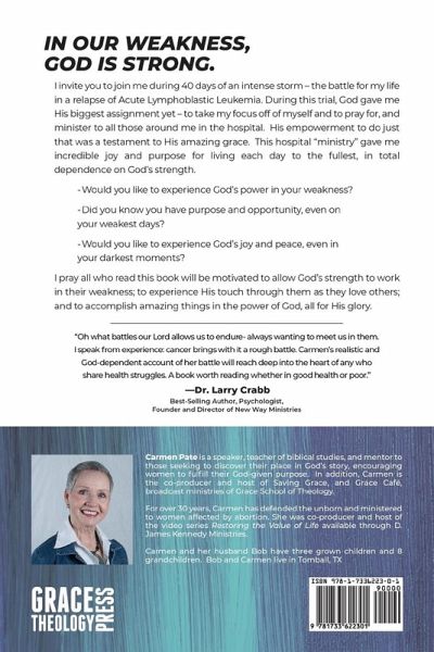 In our weakness, God is strong. I invite you to join me during 40 days of an intense storm – the battle for my life in a relapse of Acute Lymphoblastic Leukemia. During this trial, God gave me His biggest assignment yet – to take my focus off of myself and to pray for, and minister to all those around me in the hospital. His empowerment to do just that was a testament to His amazing grace. This hospital "ministry" gave me incredible joy and purpose for living each day to the fullest, in total dependence on God’s strength. Would you like to experience God’s power in your weakness? - Did you know you have purpose and opportunity, even on your weakest days? Would you like to experience God’s joy and peace, even in your darkest moments? I pray all who read this book will be motivated to allow God’s strength to work in their weakness; to experience His touch through them as they love others; and to accomplish amazing things in the power of God, all for His glory.