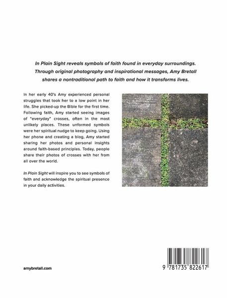 In Plain Sight reveals symbols of faith found in everyday surroundings. Through original photography and inspirational messages, Amy Bretall shares a nontraditional path to faith and how it transforms lives. Take a journey of faith, on a non-traditional path, to develop and deepen your faith. See a new perspective of the presence of God in your everyday life. Experience the art of faith with over 50 unique color photos of "everyday" unformed crosses with inspiring messages of faith, hope, and belief. Ideal for small groups, book clubs, and devotional. In her early 40's Amy experienced personal struggles that took her to a low point in her life. With prayer and following faith, Amy started seeing images of "everyday" crosses, often in the most unlikely places. These unformed symbols were her spiritual nudge to keep going. Using only her phone camera, Amy started sharing her photos and personal insights around faith-based principles. Today, people share their photos of crosses with her from all over the world. In Plain Sight will inspire you to see symbols of faith and acknowledge the spiritual presence in your daily activities. Features: ¿Original photography ¿Full color, premium printed pages ¿Thick paper ¿Artful design ¿8" x 10", hardcover, case laminate, 102 numbered pages (108 total pages) More info: amybretall.com Connect on Instagram @amybretall
