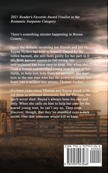 There's something sinister happening in Boone County... Since the debacle involving her friends and her ex, Rayna Nydert has kept to herself. Duped by the rotten bastard, she still feels guilty for her part in it all. With harvest season in full swing, her self-isolation has been easy to keep. But when she finds a beaten and terrified young man in one of her fields, to help him hide from his pursuers, she must turn to the one man who has the power to shatter her heart into a million tiny pieces, Thomas Archer. It's been years since Thomas and Rayna dated. Life led them in different directions, but for Thomas, the torch never died. Rayna's always been his one and only. When she calls on him to help her care for the scared young man, he can't say no. They soon discover, though, that they've stumbled over a dark secret. One that someone would kill to keep.