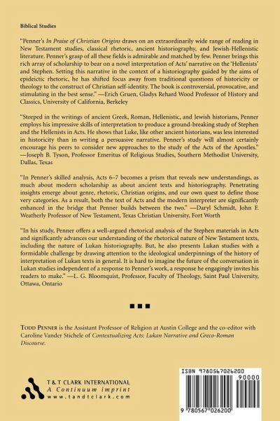 Almost all scholars look to Acts 6:1-8:3 as providing the bedrock of early Christian tradition. The incident between the Hebrews and the Hellenists are understood to reflect real historical and theological problems in the early Jerusalem community, demonstrating the Hellenist role as a historical bridge between Jesus and Paul. Penner's study challenges the fundamental assumptions of this approach. Penner emphasizes the rhetorical and moral dimensions of ancient historiographical theory, especially the centrality of narrative and plot, the use of vivid description, the application of comparison using various type-scenes, and the role of speeches in terms of characterization and the presentation of narrative style. Todd Penner is the Assistant Professor of Religion at Austin College and the co-editor with Caroline Vander Stichele of Contextualizing Acts: Lukan Narrative and Greco-Roman Discourse.