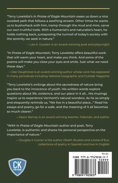 In Praise of Eagle Mountain is a book of poetry and prose that explores themes of nature, solitude, and spiritual reflection. The author presents a contrast between two worlds: the chaotic, drama-filled world of human society and the peaceful, meaningful solitude found in nature. These insights describe parallel paths. The well worn trails of societies hectic pace can leave you feeling overwhelmed by the "crowd of madmen" and the "self-induced churn" of modern life. While the serene trails in nature serve as a soothing soul-balm for those who seek refuge in wild places. A place where it's possible to reconnect with a deeper sense of belonging. This book offers perspectives gained during the author's retreats into nature. Similar to the creative energy of Thoreau at Walden Pond, his musings come to light in the quiet beauty of Eagle Mountain. These reflections arrive in the form of poetry and prose inspired by experiences on wooded paths, placid lakes, and misty mountain tops. The author suggests that while it's possible to maintain presence and peace in society, one can find a more profound connection to something greater than themselves when immersed in natural settings. This heartfelt work is both personal and universal in its approach - while sharing individual experiences and philosophies, the author acknowledges that each person must choose their own life path. The overall tone suggests themes of praise, hope, and optimism, with the stated aim of sharing these positive perspectives with readers.