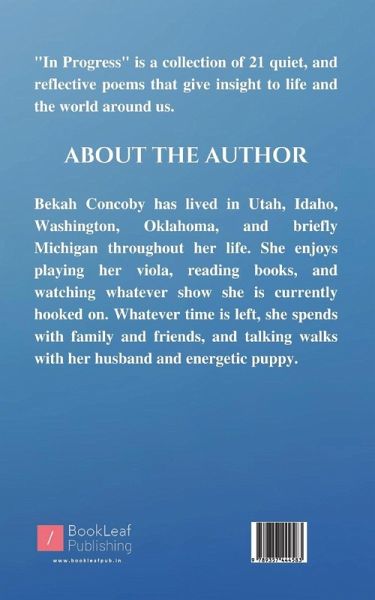 "In Progress" is a collection of 21 quiet, and reflective poems that give insight to life and the world around us.