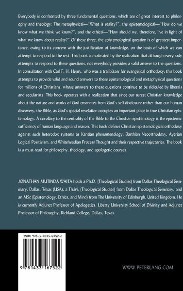 Everybody is confronted by three fundamental questions, which are of great interest to philosophy and theology: The metaphysical-"What is reality?", the epistemological-"How do we know what we think we know?", and the ethical-"How should we, therefore, live in light of what we know about reality?" Of these three, the epistemological question is of greatest importance, owing to its concern with the justification of knowledge, on the basis of which we can attempt to respond to the rest. This book is motivated by the realization that although everybody attempts to respond to these questions, not everybody provides a valid answer to the questions. In consultation with Carl F. H. Henry, who was a trailblazer for evangelical orthodoxy, this book attempts to provide valid and sound answers to these epistemological and metaphysical questions for millions of Christians, whose answers to these questions continue to be ridiculed by liberals and secularists. This book operates with a realization that since our surest Christian knowledge about the nature and works of God emanates from God's self-disclosure rather than our human discovery, the Bible, as God's special revelation occupies an important place in true Christian epistemology. A corollary to the centrality of the Bible to the Christian epistemology is the epistemic sufficiency of human language and reason. This book defines Christian epistemological orthodoxy against such heterodox systems as Kantian phenomenology, Barthian Neoorthodoxy, Ayerian Logical Positivism, and Whiteheadian Process Thought and their respective trajectories. The book is a must-read for philosophy, theology, and apologetic courses.