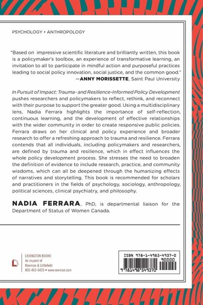 In Pursuit of Impact pushes researchers and policymakers to reflect, rethink, and reconnect with their purpose to support the greater good by developing meaningful public policies. Through a multidisciplinary lens, Nadia Ferrara, draws on research, clinical, and policy experience to show how we can engage in learning, and building more effective relationships to better support the development of responsive policies. Ferrara offers a refreshing analysis while integrating a new approach to understanding trauma and resilience that places a humanizing emphasis on the power of narratives and storytelling. Revisiting the theories of pioneer thinkers and showing the relevance of their work is the necessary rethinking required to support the shift towards an evidence-informed policy development process. Ferrara highlights the fact that people, and their own lived realities, are defined by trauma and resilience and are engaged in the development of public policy and are affected by implemented policies. This book is recommended for scholars and practitioners in the fields of psychology, sociology, anthropology, political sciences, clinical psychiatry, and philosophy.