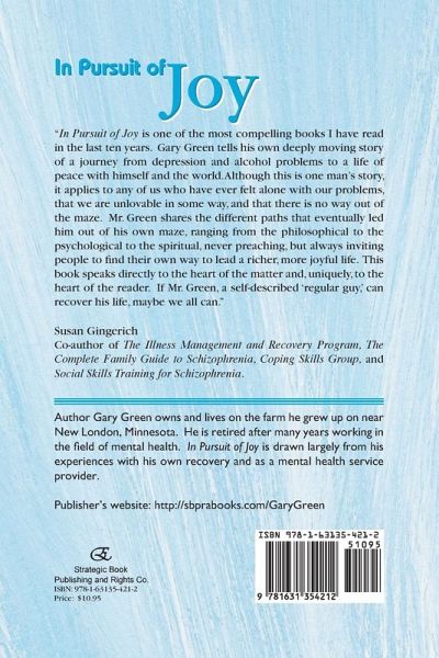 "In Pursuit of Joy is one of the most compelling books I have read in the last ten years. Gary Green tells his own deeply moving story of a journey from depression and alcohol problems to a life of peace with himself and the world. Although this is one man's story, it applies to any of us who have ever felt alone with our problems, that we are unlovable in some way, and that there is no way out of the maze. Mr. Green shares the different paths that eventually led him out of his own maze, ranging from the philosophical to the psychological to the spiritual, never preaching, but always inviting people to find their own way to lead a richer, more joyful life. This book speaks directly to the heart of the matter and, uniquely, to the heart of the reader. If Mr. Green, a self-described 'regular guy,' can recover his life, maybe we all can." Susan Gingerich, co-author of The Illness Management and Recovery Program, The Complete Family Guide to Schizophrenia, Coping Skills Group, and Social Skills Training for Schizophrenia. About the Author Author Gary Green owns and lives on the farm he grew up on near New London, Minnesota. He is retired after many years working in the field of mental health. In Pursuit of Joy is drawn largely from his experiences with his own recovery and as a mental health service provider. Publisher's website: http://sbprabooks.com/GaryGreen