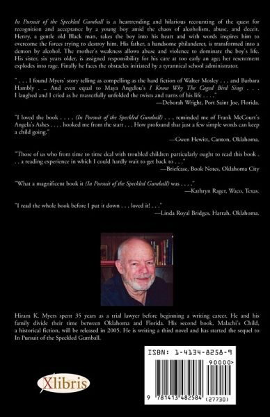 In Pursuit of the Speckled Gumball is a heartrending and hilarious recounting of the quest for recognition and acceptance by a young boy amid the chaos of alcoholism, abuse, and deceit. Henry, a gentle old Black man, takes the boy into his heart and with words inspires him to overcome the forces trying to destroy him. His father, a handsome philandered, is transformed into a demon by alcohol. The mother's weakness allows abuse and violence to dominate the boy's life. His sister, six years older, is assigned responsibility for his care at too early an age; her resentment explodes into rage. Finally he faces the obstacles initiated by a tyrannical school administrator. " . . . I found Myers' story telling as compelling as the hard fiction of Walter Mosley . . . and Barbara Hambly . .. And even equal to Maya Angelou's I Know Why The Caged Bird Sings . . . I laughed and I cried as he masterfully unfolded the twists and turns of his life. . . ." -Deborah Wright, Port Saint Joe, Florida. "I loved the book . . . . (In Pursuit of the Speckled Gumball) . . . reminded me of Frank McCourt's Angela's Ashes . . . . hooked me from the start . . . How profound that just a few simple words can keep a child going." -Gwen Hewitt, Canton, Oklahoma. "Those of us who from time to time deal with troubled children particularly ought to read this book . . . a reading experience in which I could hardly wait to get back to . . ." -Briefcase, Book Notes, Oklahoma City "What a magnificent book it (In Pursuit of the Speckled Gumball) was. . . . " -Kathryn Rager, Waco, Texas. . "I read the whole book before I put it down . . . loved it! . . ." -Linda Royal Bridges, Harrah, Oklahoma.