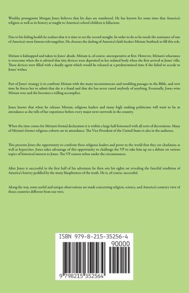 Wealthy protagonist Morgan Jones believes that his days are numbered. He has known for some time that America's religion as well as its history as taught to America's school children is fallacious. Due to his failing health he realizes that it is time to set the record straight. In order to do so he needs the assistance of one of America's most famous televangelists. He chooses the darling of America's faith healers Miriam Starbuck to fill this role. Miriam is kidnapped and taken to Jones' abode. Miriam is, of course, uncooperative at first. However, Miriam's reluctance is overcome when she is advised that tiny devices were deposited in her sedated body when she first arrived at Jones' villa. These devices were filled with a deadly agent which would be released at a predetermined time if she failed to accede to Jones' wishes. Part of Jones' strategy is to confront Miriam with the many inconsistencies and troubling passages in the Bible, and over time he forces her to admit that she is a fraud and that she has never cured anybody of anything. Eventually, Jones wins Miriam over and she becomes a willing accomplice. Jones knows that when he releases Miriam, religious leaders and many high ranking politicians will want to be in attendance as she tells of her experience before every major news network in the country. When the time comes for Miriam's formal declaration it is within a large hall festooned with all sorts of decorations. Many of Miriam's former religious cohorts are in attendance. The Vice President of the United States is also in the audience. This presents Jones the opportunity to confront these religious leaders and prove to the world that they are charlatans as well as hypocrites. Jones takes advantage of this opportunity to challenge the VP to take him up on a debate on various topics of historical interest to Jones. The VP cannot refuse under the circumstances. After Jones is successful in the first half of his adventure he then sets his sights on revealing the fanciful rendition of America's history peddled by the many blasphemers of the truth. He is, of course, successful. Along the way, some useful and unique observations are made concerning religion, science, and America's contrary view of those countries different from our own.