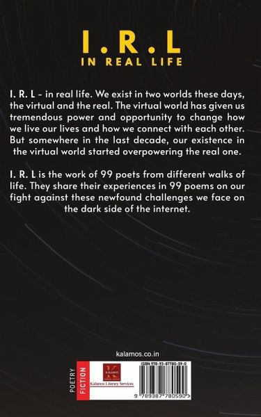 I. R. L - in real life. We exist in two worlds these days, the virtual and the real. The virtual world has given us tremendous power and opportunity to change how we live our lives, how we connect with each other and countless other ways. But somewhere in the last decade, our existence in the virtual world started overpowering the real one. I. R. L is the work of 99 poets from different walks of life. They share their experiences in 99 poems on our fight against these newfound challenges we face on the dark side of the internet.