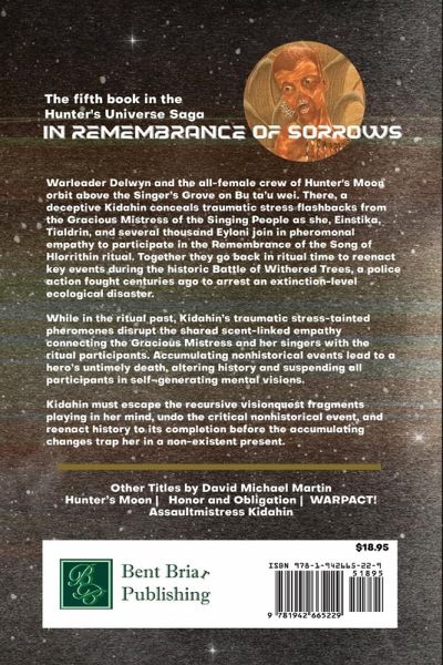 Warleader Delwyn and the all-female crew of Hunter's Moon orbit above the Singer's Grove on Bu ta'u wei. There, a deceptive Kidahin conceals traumatic stress flashbacks from the Gracious Mistress of the Singing People as she, Einstika, Tialdrin, and several thousand Eyloni join in pheromonal empathy to participate in the Remembrance of the Song of Hlorrithin ritual. Together, they go back in ritual time to reenact key events during the historic Battle of Withered Trees, a police action fought centuries ago to arrest an extinction-level ecological disaster. While in the ritual past, Kidahin's traumatic stress-tainted pheromones disrupt the shared scent-linked empathy connecting the Gracious Mistress and her singers with the ritual participants. Accumulating nonhistorical events lead to a hero's untimely death, altering history and suspending all participants in self¬generating mental visions. Kidahin must escape the recursive vision quest fragments playing in her mind, undo the critical nonhistorical event, and reenact history to its completion before the accumulating changes trap her in a non-existent present.