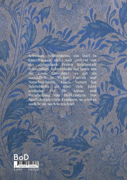 Schwaam, Schwebheim, ein Dorf in Unterfranken, nicht weit entfernt von der ehemaligen Freien Reichsstadt Schweinfurt. Schwebheim hat heute um die 4.000 Einwohner, es gilt als vorbildlich in Sachen Umwelt und Naturbeachtung. Einen Namen hat Schwebheim als über viele Jahre zentraler Ort für Anbau und Verarbeitung von Heilkräutern. Das Apothekergärtchen Frankens, so wird es auch heute noch bezeichnet.