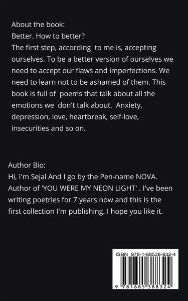 Better. How to better? The first step, according to me is, accepting ourselves. To be a better version of ourselves we need to accept our flaws and imperfections. We need to learn not to be ashamed of them. This book is full of poems that talk about all the emotions we don't talk about. Anxiety, depression, love, heartbreak, self-love, insecurities and so on.