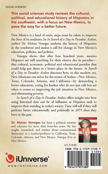 New Mexico is a land of crisis; steps must be taken to improve the lives of its residents. In In Search of a Day in Paradise: Aztlan, author Dr. Moises Venegas analyzes the history of Hispanics in the southwest and makes a call for change in New Mexico's education, policies, and politics. Venegas shows that after four hundred years, mestizo Hispanos are still searching for their elusive day in paradise-that cultural, economic, political and educational paradise that could help put them in a better place in the future. In Search of a Day in Paradise: Aztlan discusses how, in this modern era, New Mexicans can strive for the return of Aztlan-New Mexico, Texas, Colorado, Arizona, and California-by demanding a better education , voting for leaders who do not just talk but act when it comes to improving the job situation in New Mexico, and eliminating poverty. In Search of a Day in Paradise: Aztlan offers insight into how using historical data can be of influence as Hispanos seek to improve their standing in today's society. Time will tell if they will perform better educationally and politically in 2075 than they have in the past.