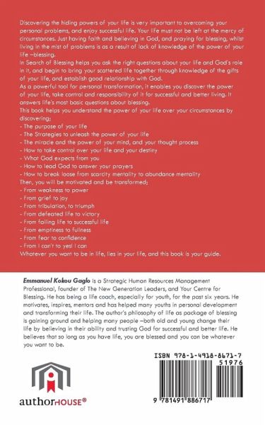 Discovering the hiding powers of your life is very important to overcoming your personal problems, and enjoy successful life. Your life must not be left at the mercy of circumstances. Just having faith and believing in God, and praying for blessing, whilst living in the mist of problems is as a result of lack of knowledge of the power of your life -blessing. In Search of Blessing helps you ask the right questions about your life and God's role in it, and begin to bring your scattered life together through knowledge of the gifts of your life, and establish good relationship with God. As a powerful tool for personal transformation, it enables you discover the power of your life, take control and responsibility of it for successful and better living. It answers life's most basic questions about blessing. This book helps you understand the power of your life over your circumstances by discovering; - The purpose of your life - The Strategies to unleash the power of your life - The miracle and the power of your mind, and your thought process - How to take control over your life and your destiny - What God expects from you - How to lead God to answer your prayers - How to break loose from scarcity mentality to abundance mentality Then, you will be motivated and be transformed; - From weakness to power - From grief to joy - From tribulation, to triumph - From defeated life to victory - From failing life to successful life - From emptiness to fullness - From fear to confidence - From I can't to yes! I can Whatever you want to be in life, lies in your life, and this book is your guide.