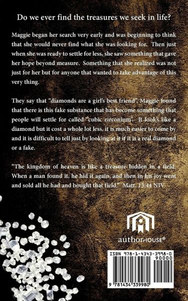 Do we ever find the treasures we seek in life? Maggie began her search very early and was beginning to think that she would never find what she was looking for. Then just when she was ready to settle for less, she saw something that gave her hope beyond measure. Something that she realized was not just for her but for anyone that wanted to take advantage of this very thing. They say that "diamonds are a girl's best friend", Maggie found that there is this fake substance that has become something that people will settle for called "cubic zirconium". It look's like a diamond but it cost a whole lot less, it is much easier to come by and it is difficult to tell just by looking at it if it is a real diamond or a fake. "The kingdom of heaven is like a treasure hidden in a field. When a man found it, he hid it again, and then in his joy went and sold all he had and bought that field." Matt. 13:44 NIV