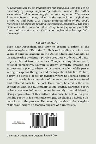 A delightful feat by an imaginative subconscious, this book is an assembly of poetry inspired by different women the author encountered while searching for his life companion. The poems have a coherent theme, which is the appreciation of feminine attributes and beauty. A deeper understanding of the poet's motivation emerges by reading the verses successively. The book climaxes with a narration of an enlightening epiphany into the inner nature and source of attraction to feminine beauty, (with glossary).