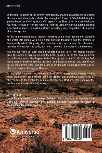 In the final decades of the twenty-first century, mankind's ambitions colonized the moon and Mars and created a "technological" Tower of Babel. But during the period known as the Fifty Years of Prosperity, the Time of Horrors came without warning. The Age of Horrors brought about the Orbs, mysterious anomalies that appeared in space, unleashing storms of cataclysmic proportions throughout the solar system. On Earth, the golden age of modern humanity came to a crashing end, plunging the world into chaos. At a time when mankind thought it had the promise of immortality within its grasp, that promise was stolen away. Once humanity traveled the heavens as gods, but now, if it hopes to survive, it must cower like moles in the shadows. But not everyone on Earth has surrendered to that fate. Two groups emerge from the rubble of civilization, and the bitter spiritual battle that has simmered for millennia intensifies beyond belief. One group is bent on displacing God, while another seeks to reunite the fallen and disenfranchised. One blames God for all the earth's woes, and the other sees mankind's alienation from God as the root cause of the Age of Horrors. In the quiet between the battles, a third group emerges to investigate the Orbs. Mankind's fate depends upon an orphan and a woman known only as the Psalter. As they enter the realm of the Deepest Darkness, they uncover the truth about a power that evil dreads.