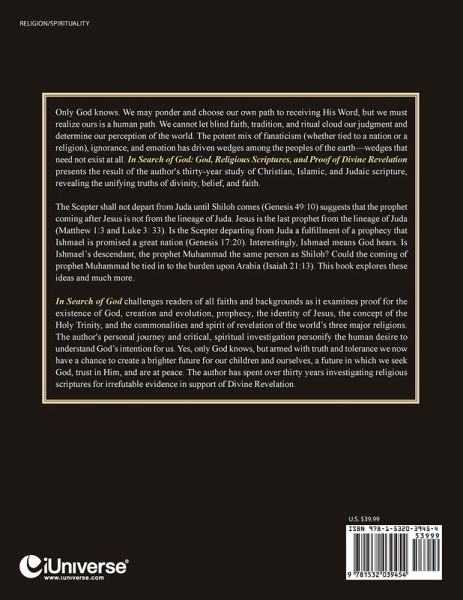 Only God knows. We may ponder and choose our own path to receiving His Word, but we must realize ours is a human path. We cannot let blind faith, tradition, and ritual cloud our judgment and determine our perception of the world. The potent mix of fanaticism (whether tied to a nation or a religion), ignorance, and emotion has driven wedges among the peoples of the earthwedges that need not exist at all. In Search of God: God, Religious Scriptures, and Proof of Divine Revelation presents the result of the author's thirty-year study of Christian, Islamic, and Judaic scripture, revealing the unifying truths of divinity, belief, and faith. The Scepter shall not depart from Juda until Shiloh comes (Genesis 49:10) suggests that the prophet coming after Jesus is not from the lineage of Juda. Jesus is the last prophet from the lineage of Juda (Matthew 1:3 and Luke 3: 33). Is the Scepter departing from Juda a fulfillment of a prophecy that Ishmael is promised a great nation (Genesis 17:20). Interestingly, Ishmael means God hears. Is Ishmaels descendant, the prophet Muhammad the same person as Shiloh? Could the coming of prophet Muhammad be tied in to the burden upon Arabia (Isaiah 21:13). This book explores these ideas and much more. In Search of God challenges readers of all faiths and backgrounds as it examines proof for the existence of God, creation and evolution, prophecy, the identity of Jesus, the concept of the Holy Trinity, and the commonalities and spirit of revelation of the worlds three major religions. The author's personal journey and critical, spiritual investigation personify the human desire to understand Gods intention for us. Yes, only God knows, but armed with truth and tolerance we now have a chance to create a brighter future for our children and ourselves, a future in which we seek God, trust in Him, and are at peace. The author has spent over thirty years investigating religious scriptures for irrefutable evidence in support of Divine Revelation.