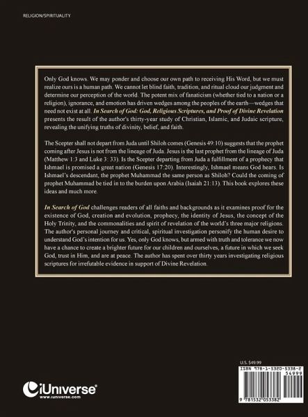Only God knows. We may ponder and choose our own path to receiving His Word, but we must realize ours is a human path. We cannot let blind faith, tradition, and ritual cloud our judgment and determine our perception of the world. The potent mix of fanaticism (whether tied to a nation or a religion), ignorance, and emotion has driven wedges among the peoples of the earthwedges that need not exist at all. In Search of God: God, Religious Scriptures, and Proof of Divine Revelation presents the result of the author's thirty-year study of Christian, Islamic, and Judaic scripture, revealing the unifying truths of divinity, belief, and faith. The Scepter shall not depart from Juda until Shiloh comes (Genesis 49:10) suggests that the prophet coming after Jesus is not from the lineage of Juda. Jesus is the last prophet from the lineage of Juda (Matthew 1:3 and Luke 3: 33). Is the Scepter departing from Juda a fulfillment of a prophecy that Ishmael is promised a great nation (Genesis 17:20). Interestingly, Ishmael means God hears. Is Ishmaels descendant, the prophet Muhammad the same person as Shiloh? Could the coming of prophet Muhammad be tied in to the burden upon Arabia (Isaiah 21:13). This book explores these ideas and much more. In Search of God challenges readers of all faiths and backgrounds as it examines proof for the existence of God, creation and evolution, prophecy, the identity of Jesus, the concept of the Holy Trinity, and the commonalities and spirit of revelation of the worlds three major religions. The author's personal journey and critical, spiritual investigation personify the human desire to understand Gods intention for us. Yes, only God knows, but armed with truth and tolerance we now have a chance to create a brighter future for our children and ourselves, a future in which we seek God, trust in Him, and are at peace. The author has spent over thirty years investigating religious scriptures for irrefutable evidence in support of Divine Revelation.