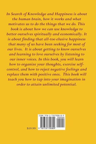 In Search of Knowledge and Happiness is about the human brain, how it works and what motivates us to do the things that we do. This book is about how to use knowledge to better ourselves spiritually and economically. It is about finding that all-too elusive happiness that many of us have been seeking for most of our lives. It is about getting to know ourselves and learning to love ourselves by listening to our inner voices. In this book, you will learn how to organize your thoughts, exercise self-control, how to reject negative feelings and replace them with positive ones. This book will teach you how to tap into your imagination in order to attain unlimited potential.